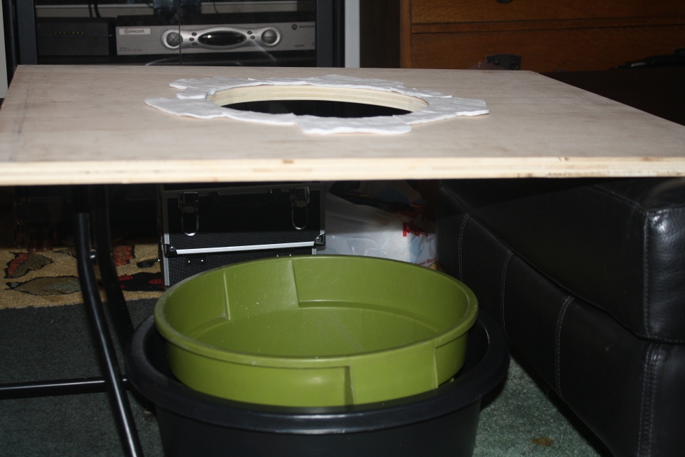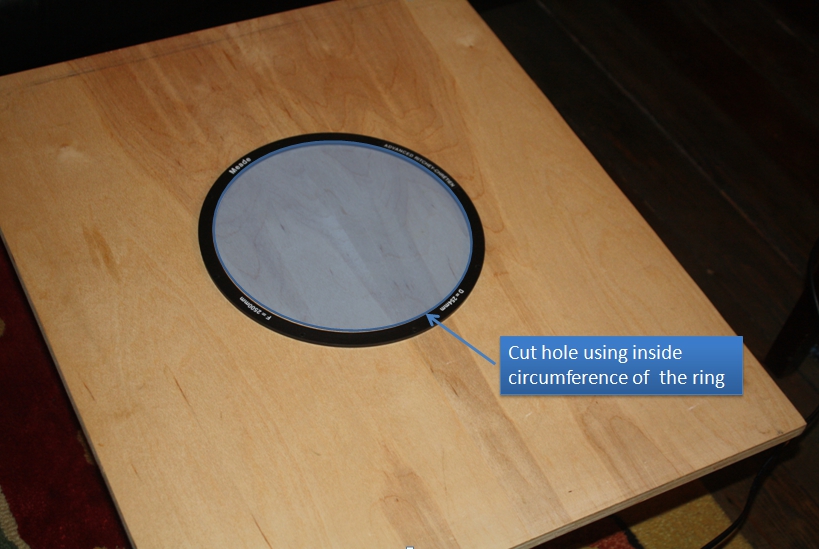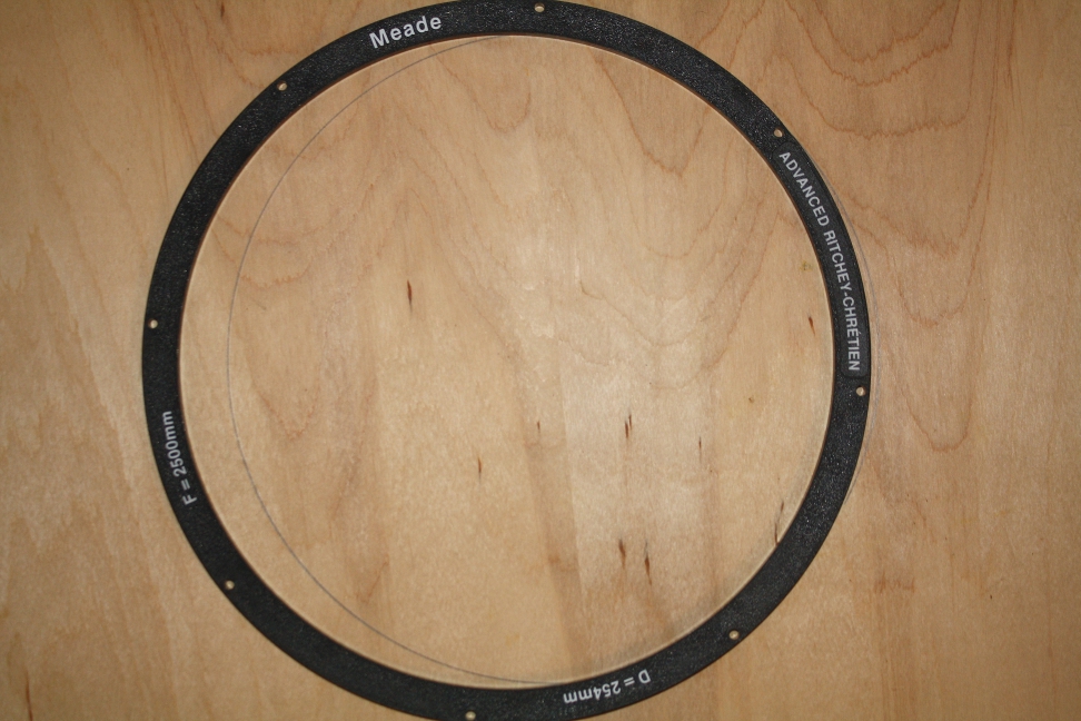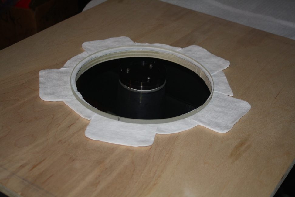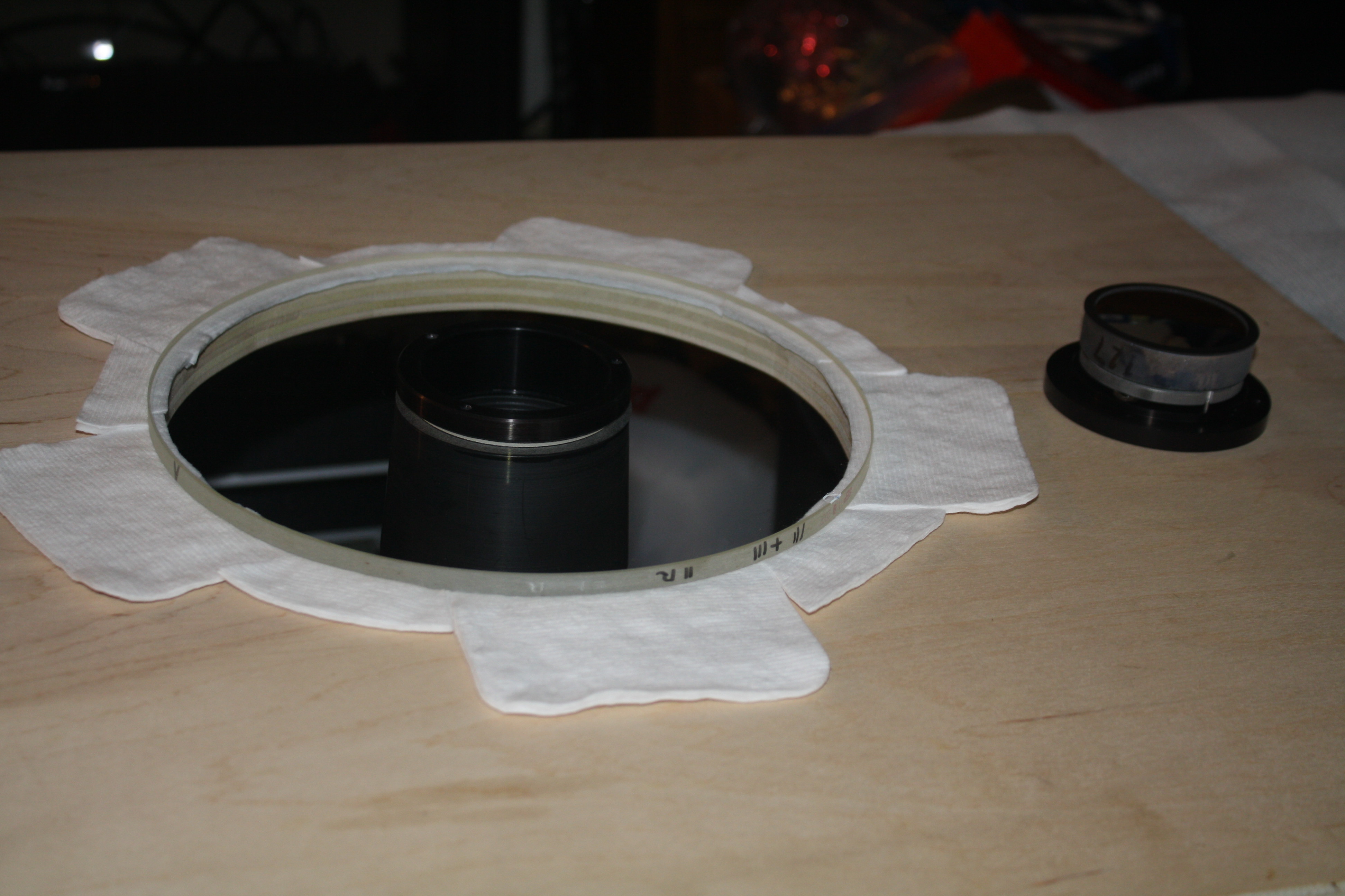 Step 4: Prepare for removal of the corrector lensThis enabled me to work with the center assembly safely away from the main mirror. I also decided this would be the perfect opportunity to clean my corrector lens at the same time. First, the plastic ring was used as a template to cut out the hole for the corrector lens support. In this way, the corrector lens could be placed on the plywood with only the periphery touching something solid (as it does within the OTA). Cotton pads were placed around the edge of the hole as shown in the image to the left. The whole board was then placed securely over a bucket, supported by two pillars (in this case, my "pillars" were a stool and an ottoman:). With the center assembly removed (of course), this setup enabled me to spray cleaner solution and distilled water directly onto the corrector lens without worrying about getting liquid in other parts of the telescope. If the board is perfectly level, the cleaning solution can also be left on the corrector for a minute or so, to allow the solution to loosen any dirt on the corrector prior to cleaning. I do NOT go into cleaning details for the corrector. You can look them up yourself on the internet. Click on any of the pictures for a larger view.