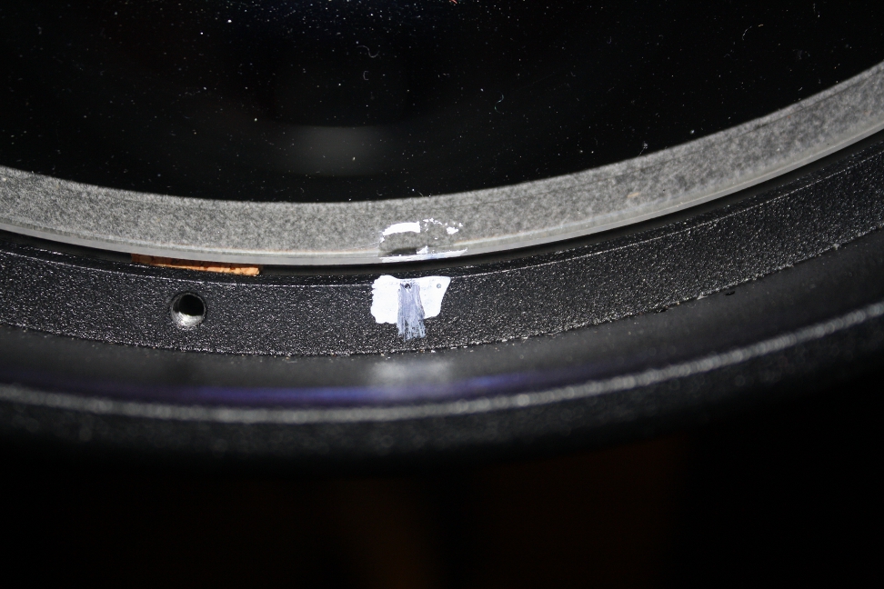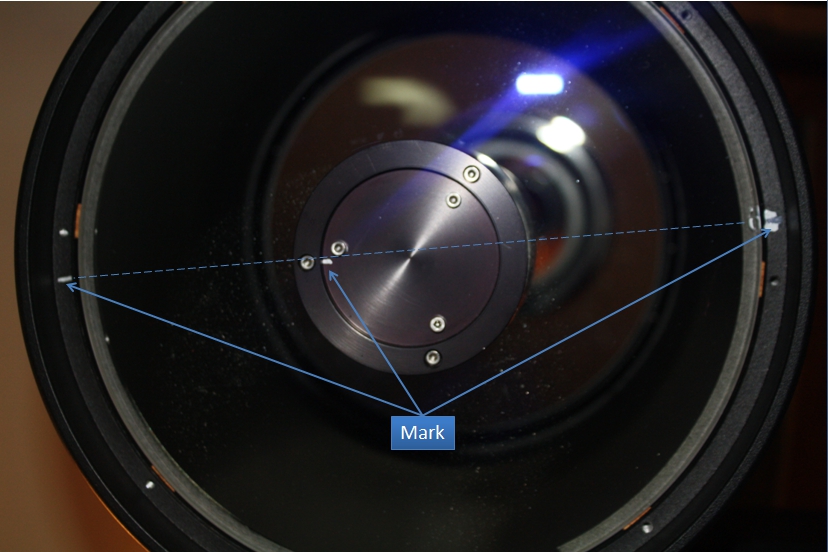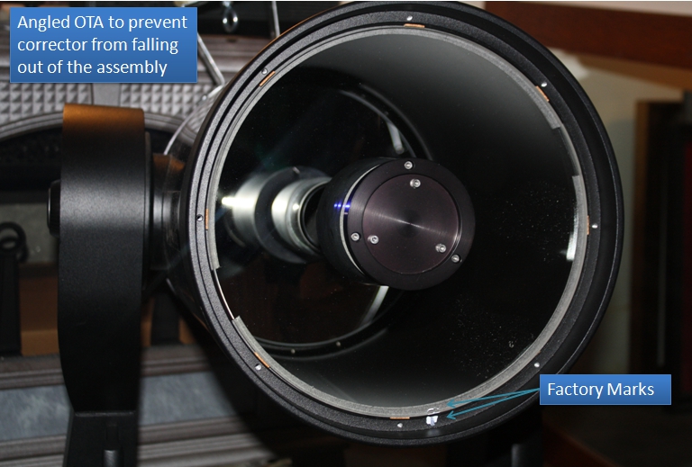Step 1: Angle OTA and remove the corrector lens plastic ring.Unscrew the 8 philips screws on the periphery of the corrector lens, being very careful NOT to allow them to drop onto the corrector lens as you remove them. Remove the ring. Note the white factory marks on both the corrector lens and the surrounding lip of the OTA. I would hope every scope has such marks. If they aren't there, or are very faint, I would suggest making your own marks so that you will always know the correct orientation of the corrector lens with respect to your main mirror. Click on any of the pictures for a larger view.