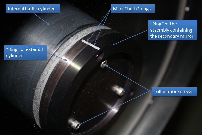 Step 2: Mark all components to insure proper reassembly.These marks will insure that you will properly reassemble the secondary cell relative to the corrector lens. Next, mark the two "rings" shown in the second image on their outer rim. These marks will insure that you know the correct positioning of the cylinders relative to the corrector lens, with the secondary mirror cell removed. Click on any of the pictures for a larger view.