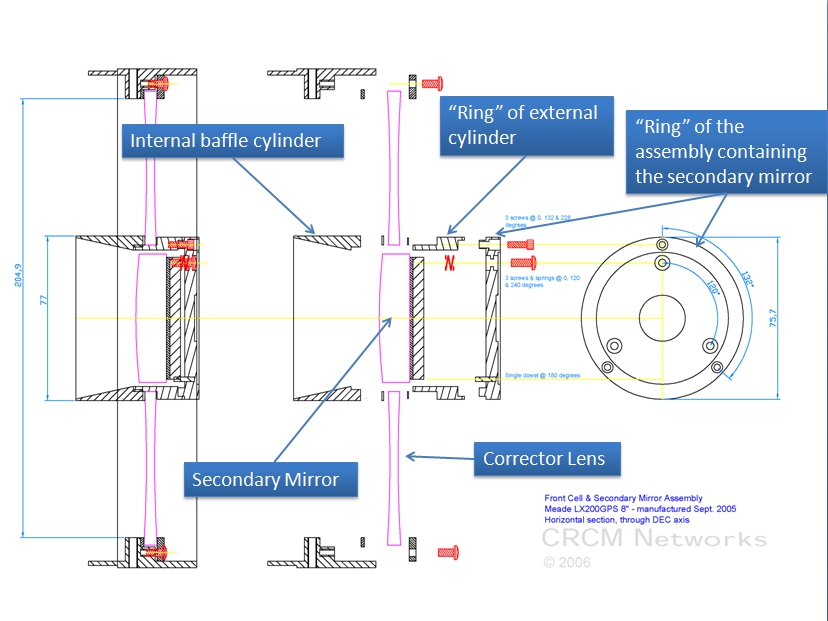 Step 3: Compare the schematic to the picture of the secondary cell.Compare this schematic with the second image in step 2 to get a good idea of the various components and how they are held together. Of course, the schematic shows the secondary mirror assembly detached from its cell. DO NOT DO THIS. The only way it can be detached is by removing all three collimation screws, which you should NOT do under ANY circumstances. Click on the schematic for a larger view.