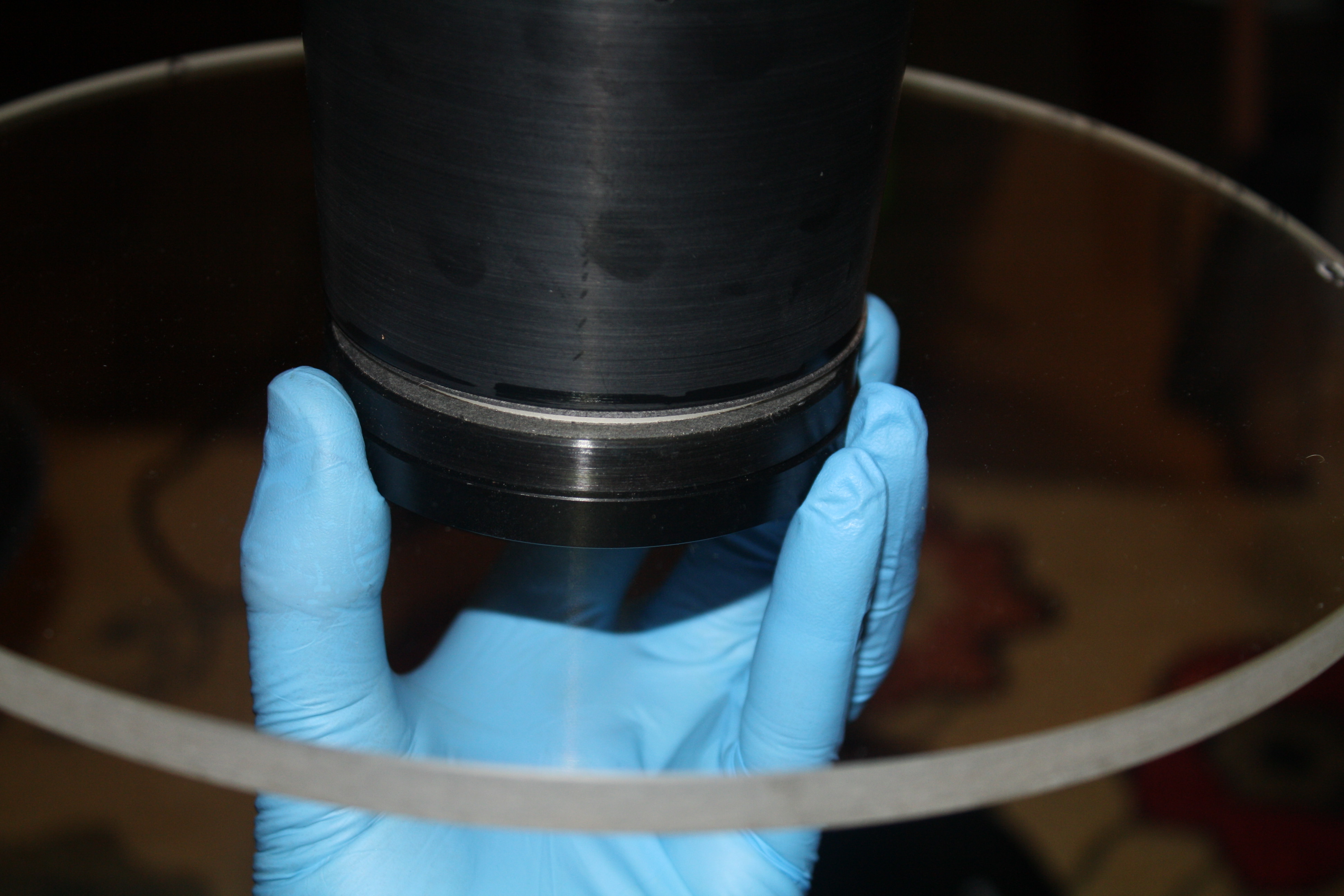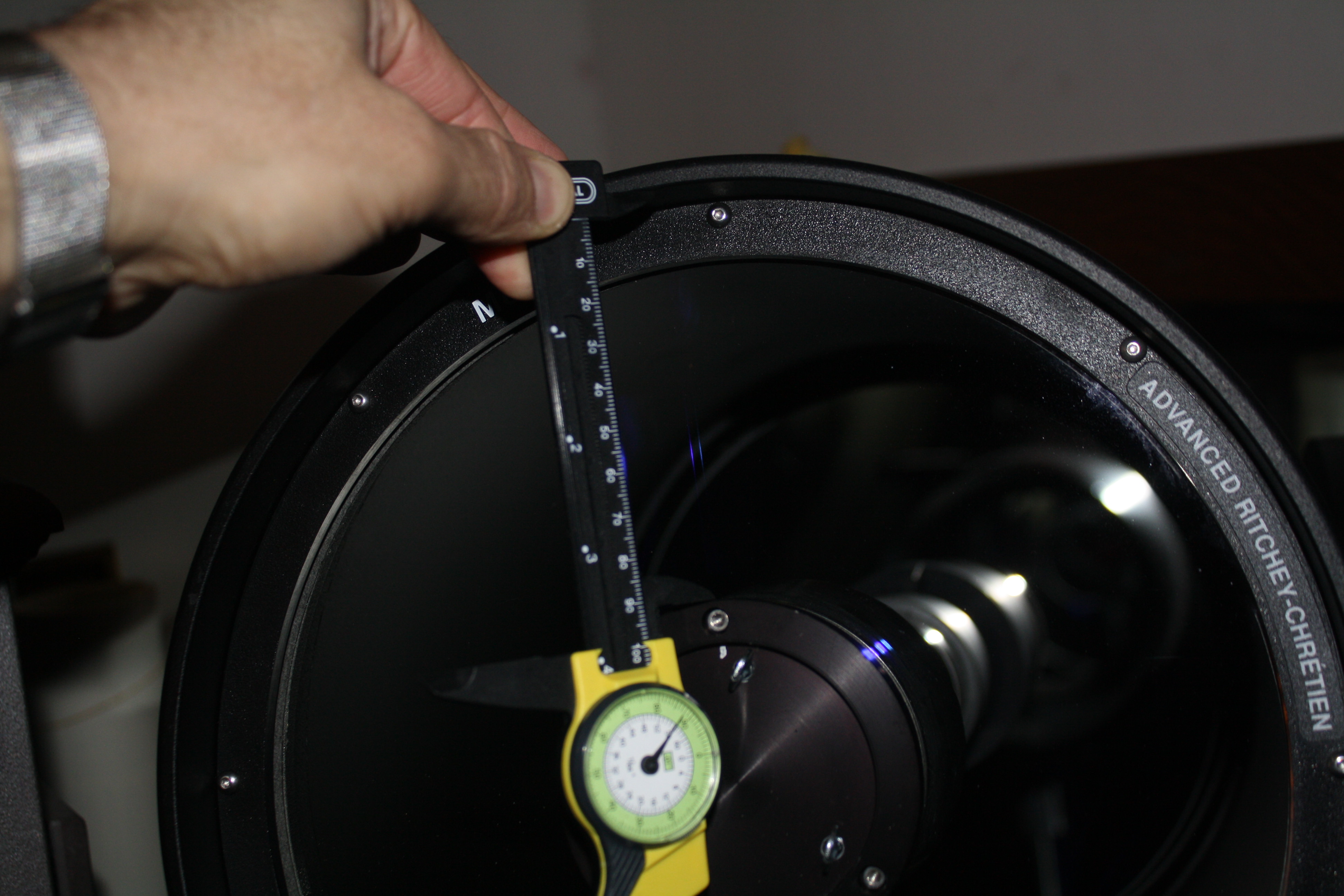 Step 8: Clean, tighten and reassembleThe rest of this is described in text, because I was too busy to take pictures! First, I blew the dust off my corrector lens, blowing it off it with a plastic bulb blower. Next, I took advantage of the bucket and hole in the center of the corrector to thoroughly clean the corrector using suggested methods. Once the corrector was clean, I began the process of reassembling the OTA. I used a caliper to measure the outside diameter of the center cell and the diameter of the corrector lens. This let me calculate a required distance from the edge of the corrector to the outer edge of the assembly, so that I could properly center the assembly in the corrector hole. I then set the caliper to the computed distance, which approximately corresponds to the distance shown in the picture on the left (except here I show it after I've reassembled the OTA, whereas the actual distance was measured with the corrector lens out of the OTA). I used that distance to properly center the assembly as I screwed the two cylinders back together. This time, however, I could tighten them more to result in a nice snug fit for the center assembly. Note: of course, the main assumption is that both the main mirror and the secodary mirrors are centered within their respective cells. And that's about it! Just remember to line up all the marks when reassembling, don't dirty up the corrector lens, and most of all, DON'T DROP ANYTHING! I'd like to give a special thanks to NeoDinian for his tips and moral support!