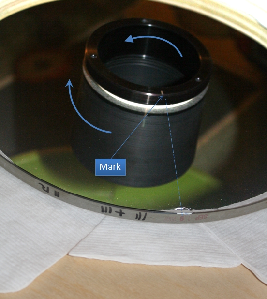 Step 7: Unscrew the secondary assembly cylinders.Now the tricky part: from the top, place fingers inside and thumb on the ring edge to get a good grip of the external(upper) cylinder. Reach with the other hand underneath the corrector lens and grip the lower cylinder. Now, slowly apply torque to turn the lower cylinder in the direction shown in the image, and the upper cylinder in the opposite direction. Important: be careful not to push up or down on the corrector lens as you turn the cylinders. For my telescope, this required a bit of force, approximately the same about of force as you would use to unscrew a jar of pickles. Click on the picture for a larger view.