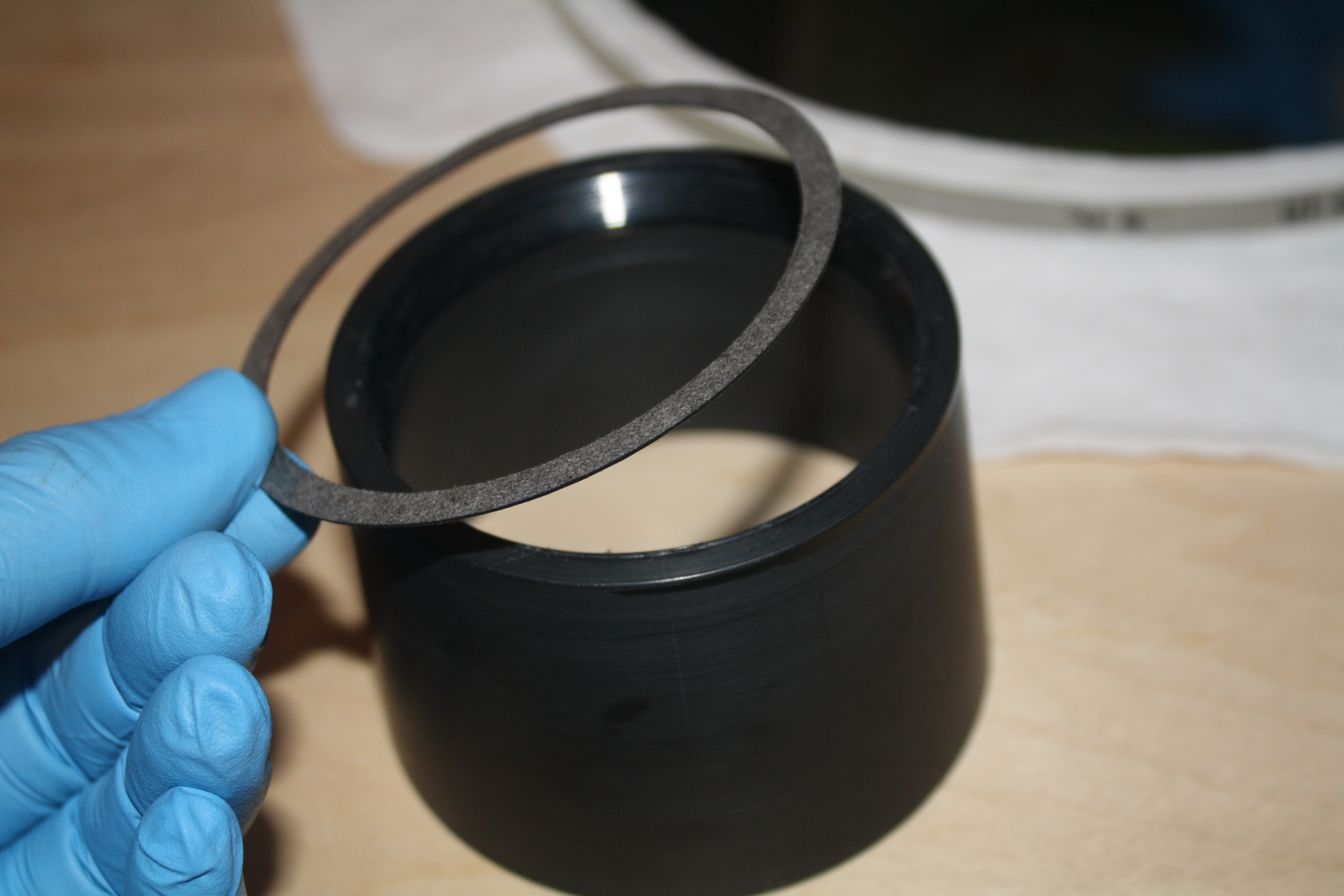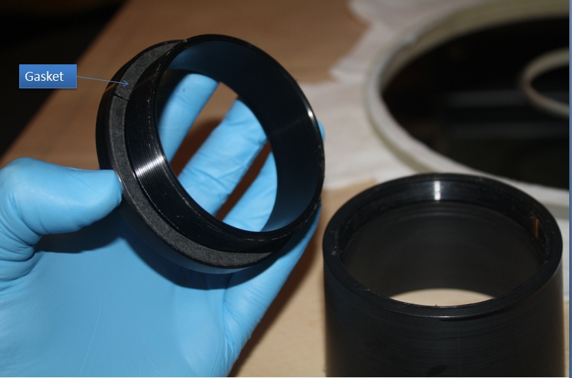 Step 8: Inspect the cylinders and gaskets.At first, I considered adding a thicker gasket. However, I decided to try to screw the two cylinders together, now that I had them away from the corrector and could experiment with as much force as I needed. On doing this, and as I mentioned in the summary, I discovered that I *could* tighten them together, but only after the threads were "worked in". This resulted in some of the thread coating "shaving" off, which I could clean away with impunity, being away from both the corrector lens and the main mirror. Doing this guaranteed that I could then easily tighten the cylinders when reassembling them, obviating the need for a thicker gasket. Click on any of the pictures for a larger view.